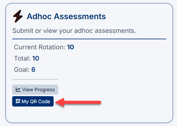 The My QR Code option on the Ad Hoc Assessments dashboard allows you to quickly generate a QR code to share with your preceptor during a clinical encounter.