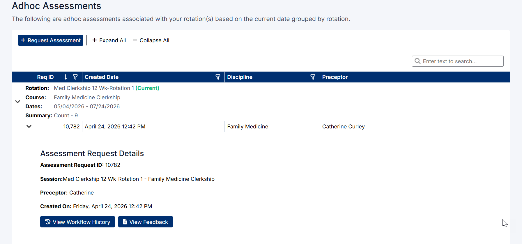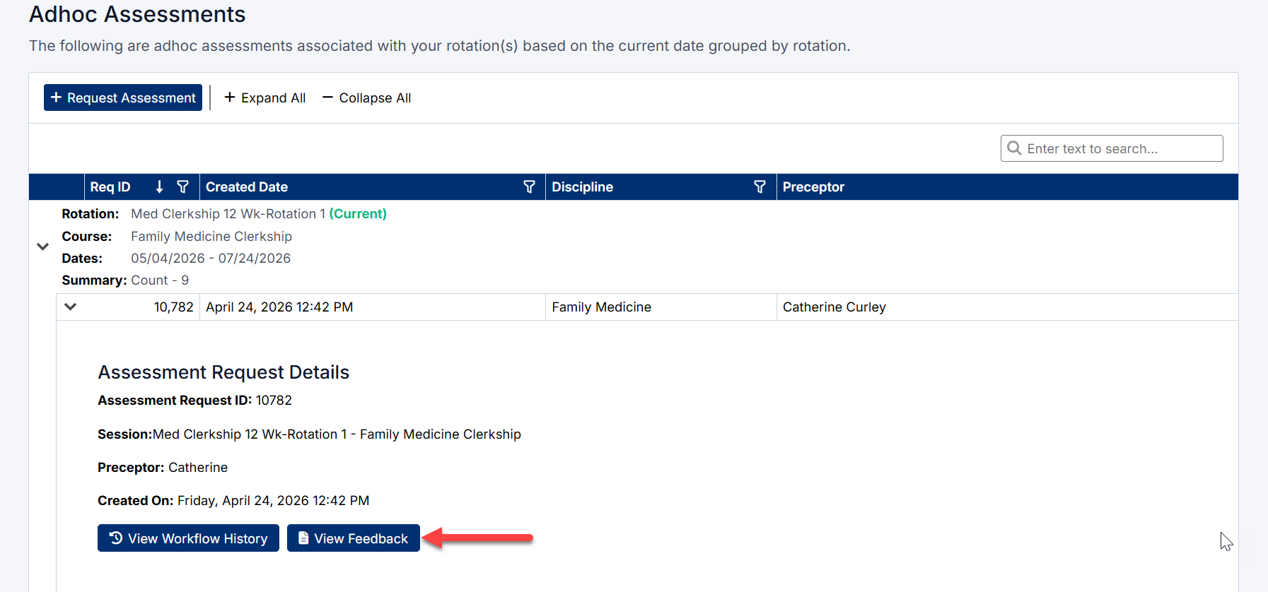 Opens the completed assessment form submitted by the preceptor - View Workflow History